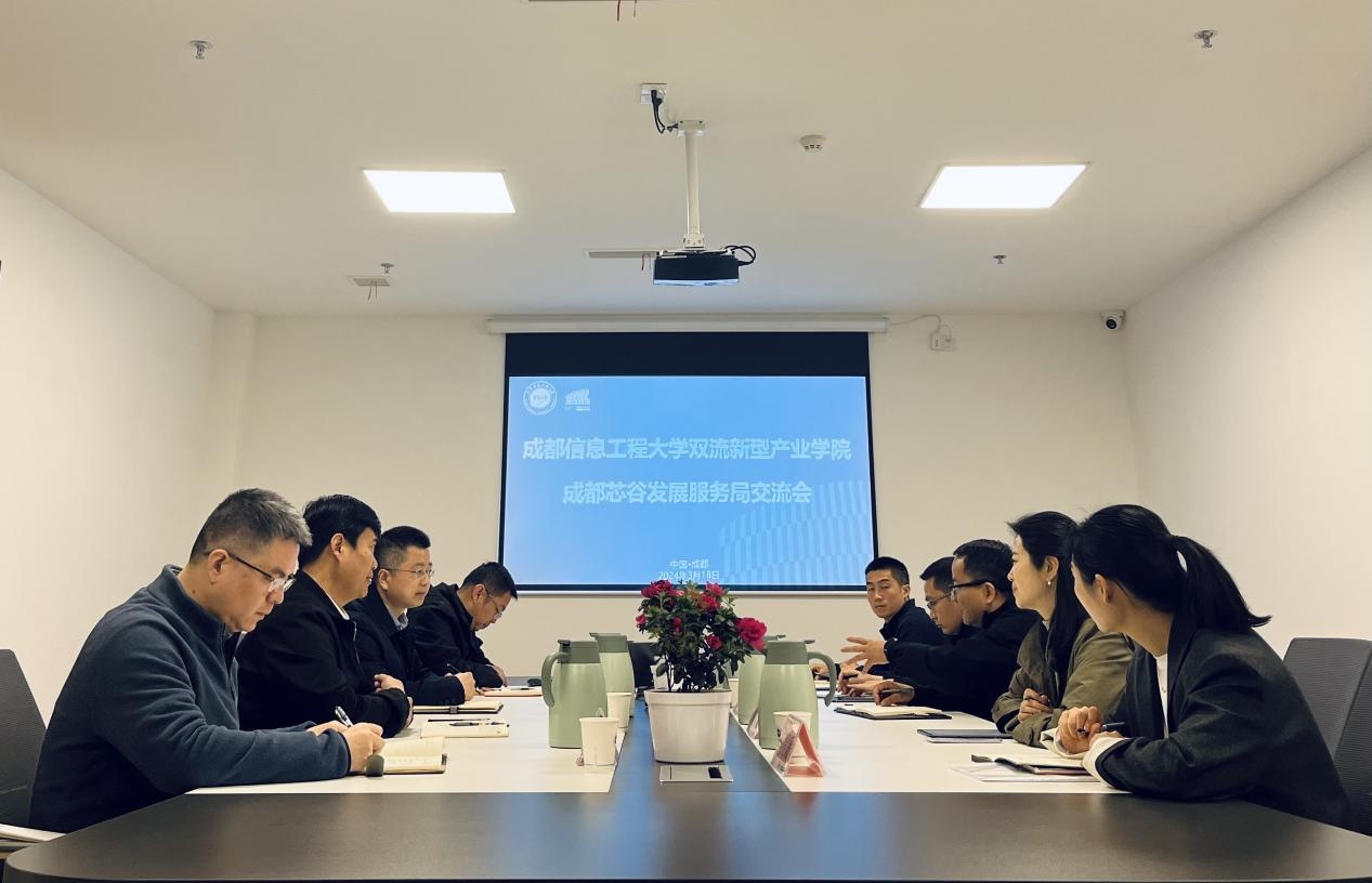 【本网讯】3月18日,双流区区委常委、宣传部部长、成都芯谷发展服务局党组书记许敬,成都芯谷发展服务局局长谢爽、副局长赵浦一行到我校双流新型产业学院调研座谈。学校科技处副处长柳锦宝,新型产业学院管委会主任陈智勇,大学科技园公司总经理刘晓阳、副总经理王强参加座谈。