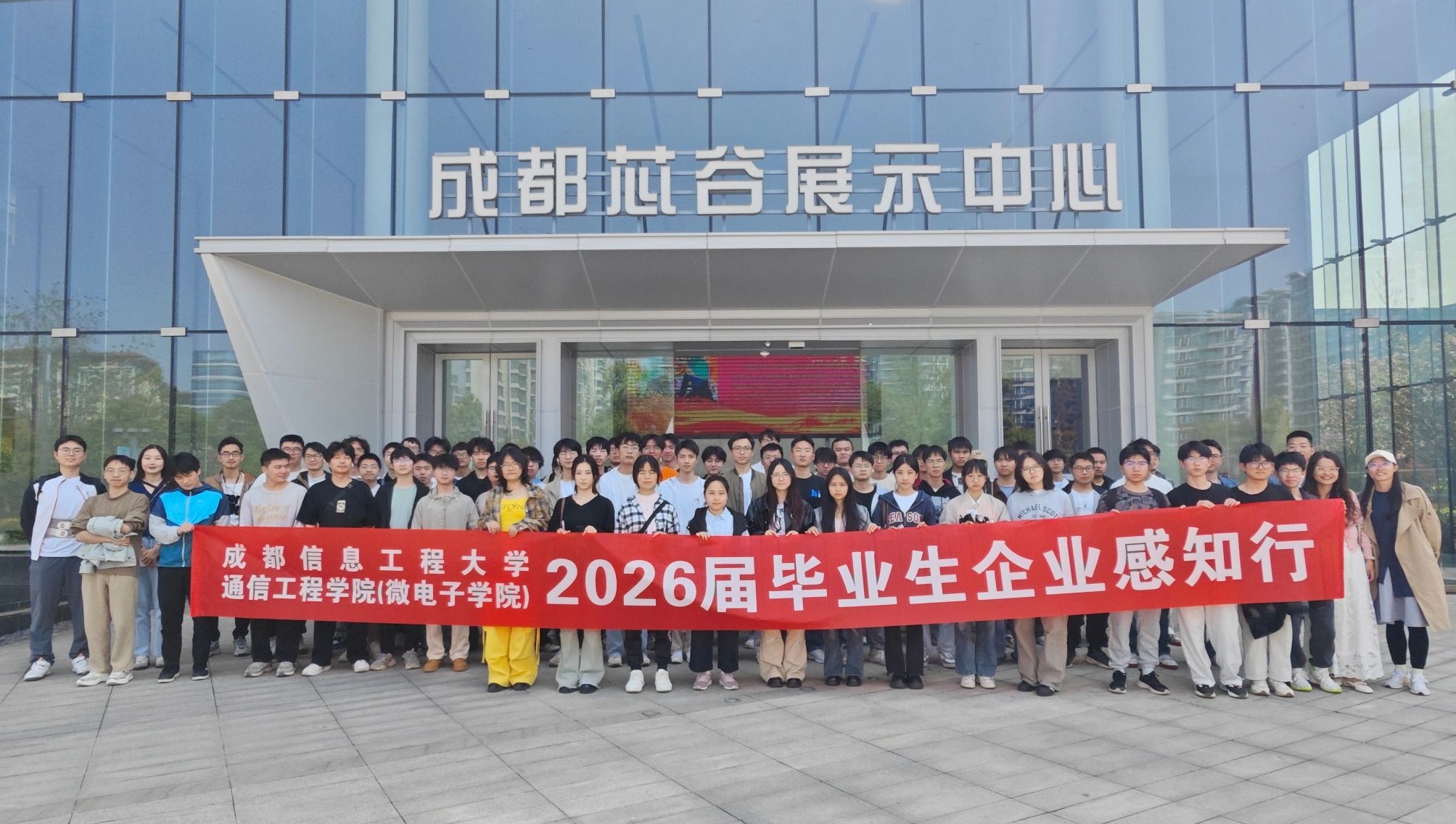 4月8日下午,通信工程学院组织了2022级集成电路设计与系统专业学生约80名前往成都芯谷产业园开展企业感知行活动。同学们首先来到成都芯谷展示中心,通过专业讲解和互动展示,全面了解了我国集成电路产业的发展历程、现状及未来趋势。展示中心先进的数字沙盘和智能交互系统,让同学们对芯片产业链有了更直观的认识。